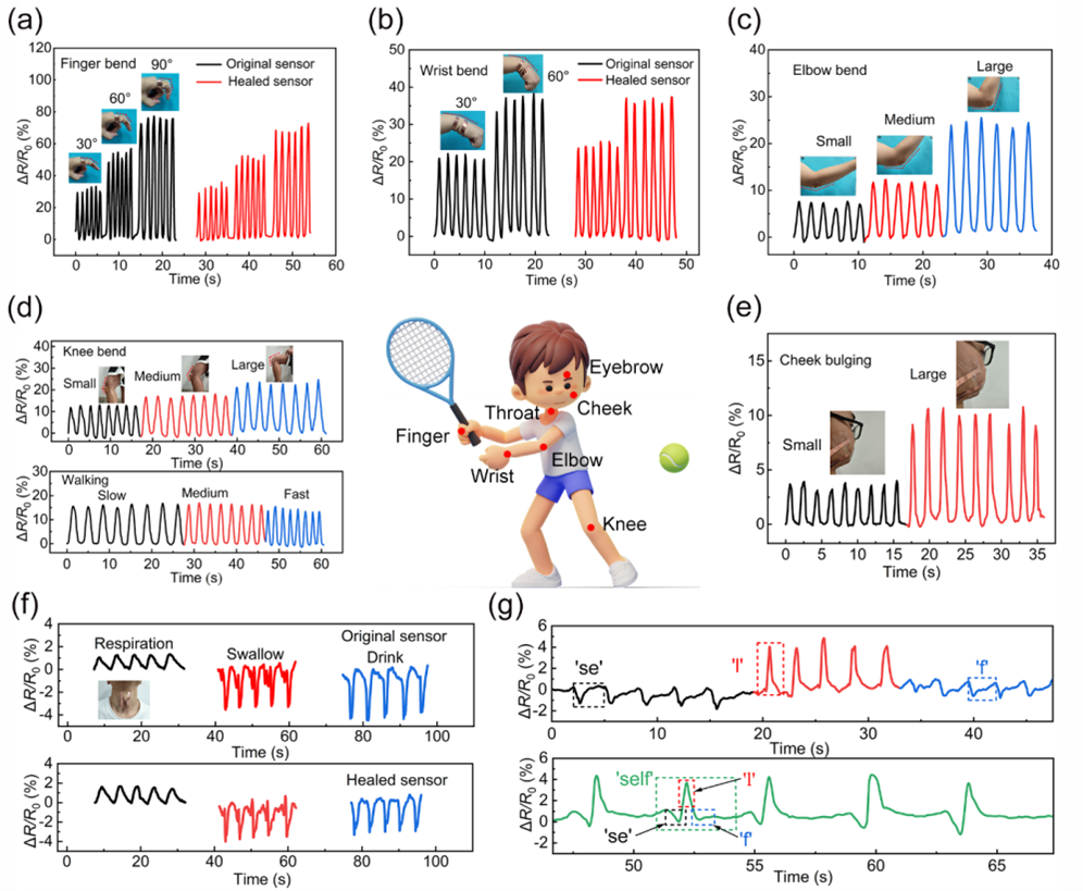 在此基础上,课题组发明了一种自修复高灵敏GelMA水凝胶应变传感器,其应变系数优于3.28、最低检测限优于0.1%、损伤后灵敏度几乎能完全自修复(~100%)。使用该柔性应变传感器成功实现了各种人体运动和重要生理信号(如心率和脉搏波)的高灵敏度可穿戴医疗监测,且损伤后自修复的柔性传感器表现出了与原始器件相当的监测能力,突显了其出色的耐用性和使用寿命(图2)。该项研究解决了柔性传感器在耐久性和机械鲁棒性方面的关键挑战,促进了GelMA水凝胶在可穿戴医疗监测领域的工程应用。