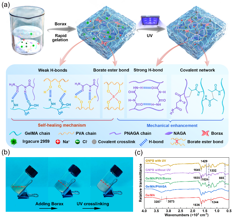 为此,受人类皮肤自我修复功能的启发,西安交通大学赵立波、李支康研究小组发明了一种具有高自愈合、高延展性和导电性的甲基丙烯酰化明胶水凝胶(Gelatin Methacryloyl, GelMA),并实现了其在长寿命、高耐用性柔性可穿戴传感领域的应用。该研究提出了一种融合互穿聚合物网络、多级氢键与硼酸酯键的创新凝胶设计策略,有效解决了水凝胶机械性能和自愈合性能在交联强度和聚合物链流动性上相互制约的难题,实现了GelMA水凝胶自愈合、拉伸性、机械强度和韧性等多性能协同提升。基于该设计策略,通过将聚乙烯醇、丙烯酰基甘氨酰胺、硼砂、氯化钠引入GelMA中,成功实现了高自愈合、拉伸性和导电性GelMA水凝胶的合成。相较于已有GelMA水凝胶,其拉伸率达到160%(提升4倍),拉伸强度达130 kPa(提升10倍),韧性达139 kJ·m-3(提升50倍),自愈合效率达86%。该策略为提高GelMA水凝胶生物电子的综合性能开辟了新途径(图1)。