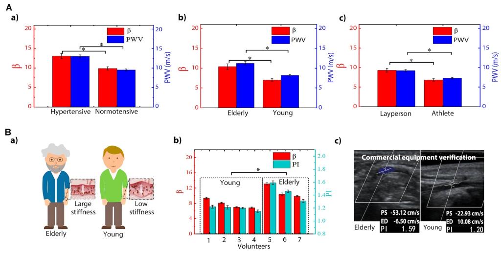 图5 基于柔性超声换能器的动脉僵硬度临床检测应用;(A)多受试者β及PWV测试结果;(B)老年人与年轻人血管僵硬度临床检测与验证。