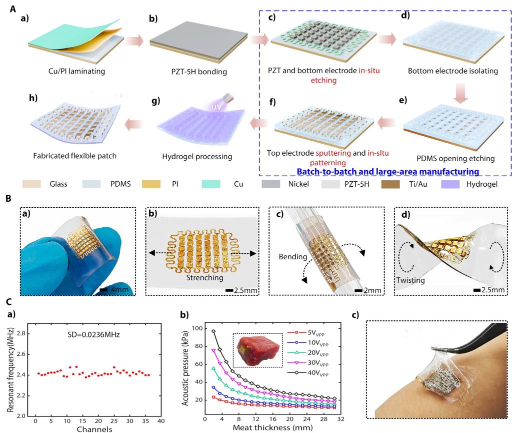 针对柔性超声器件制备中存在器件一致性差、批量化加工困难等技术瓶颈,研究团队提出了一种基于磁控溅射制备金属电极、飞秒激光刻蚀图案化压电单元以及蛇形电连接等工艺的MEMS兼容柔性超声换能器阵列制备技术,该工艺可避免现有制备技术中的大量人工操作环节,显著提升换能器结构和性能的一致性,并实现批量化与低成本制造。此外,通过UV紫外光原位固化方法制备自粘附水凝胶层,增强了换能器阵列与皮肤界面的声阻抗匹配性、生物相容性和粘附可靠性。所制备的6×6柔性超声换能器中心频率为2.4 MHz,各通道谐振频率标准差小于1.0%,发射灵敏度达2.2 kPa/V,穿透组织深度大于30 mm,表现出优异的加工一致性与声学性能,为柔性超声换能器的一致性、批量化制备提供了一种具有前景的技术路径(图2)。
