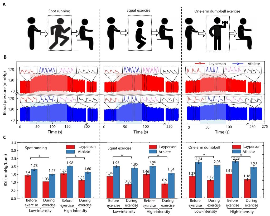 图4 基于柔性超声换能器的动态血压心率联合检测应用;(A)多类运动形式示意图;(B)运动过程连续血压心率监测;(C)RSI综合评估。
