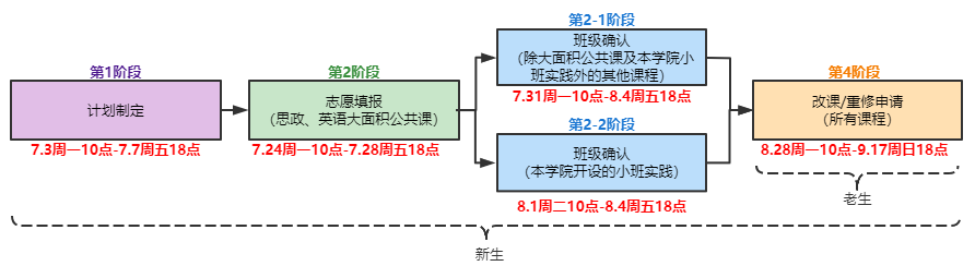 选课前请阅读《研究生选课指南》(可点击超链接跳转或下载附件查看)。新生选课包括培养计划制定、大面积公共课志愿填报、班级确认和改课4个阶段。老生的改课/重修将在最后一阶段与新生改课同时进行。
