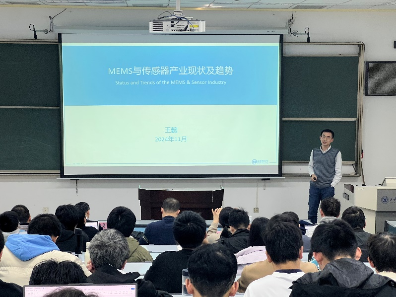 其次,企业专家王懿以《MEMS与传感器产业现状及趋势》为主题为同学们带来一场生动的主题讲座。他通过详实的数据展示传感器的市场规模、应用领域、技术进展等,引导同学对传感器进行深入思考。他指出,MEMS与传感器产业正处于快速发展期,市场需求持续增长,具有广阔的发展前景。