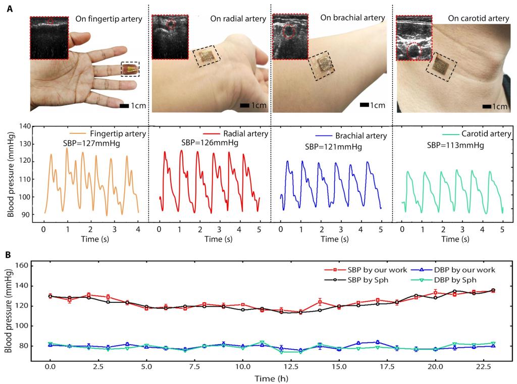 图3 基于柔性超声换能器的血压监测应用;(A)多部位连续血压波形检测;(B)24小时连续血压监测。