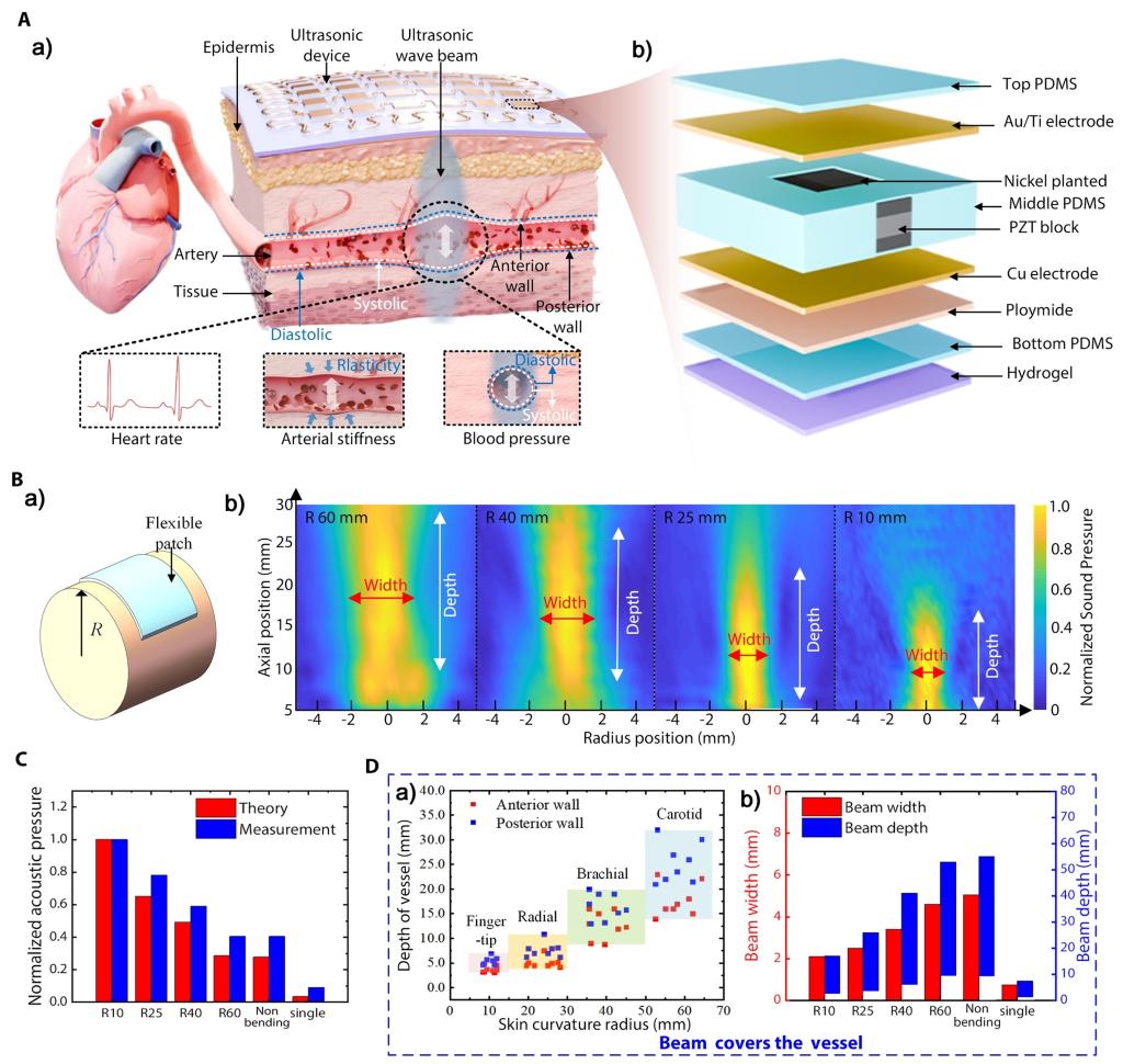 蒋庄德院士、赵立波教授团队和西安交通大学第一附属医院吕毅、吴荣谦教授团队等联合研发了一种皮肤自适应聚焦柔性微加工超声换能器阵列,可共形贴附于人体皮肤表面实现血压、心率、血管刚度等血流多参数的非侵入实时、连续检测,为心血管疾病的日常监测与早期预警提供了新技术、新希望。该研究提出了一种皮肤自适应聚焦超声(Skin-Adaptive Focused Ultrasound, SAFU)血流多参数测量方法,利用全阵元同相位激励超声和皮肤固有的曲率特性实现阵列发射超声波束的聚焦,形成“橄榄球状”声束,并基于皮肤曲率与皮下血管深度和尺寸的内在关系实现聚焦声束自适应调节。通过合理的阵列结构参数设计,所研发超声阵列的聚焦声束深度和宽度范围(波束宽度为2.1~4.6 mm,穿透深度为3.3~53 mm)可随皮肤表面曲率变化,有效覆盖指端动脉、桡动脉、肱动脉和颈动脉等人体典型动脉血管区域,实现高精度、高信噪比、宽深度范围血流参数检测。该SAFU技术可以大幅简化相控阵检测技术面临的换能器结构与控制电路系统的复杂性,提高可靠性;相对单阵元检测方法声压提高10.8倍、信噪比提高19.5 dB,兼顾了结构和性能优势,为基于超声飞行时间法的生理参数检测应用提供了理想途径(图1)。